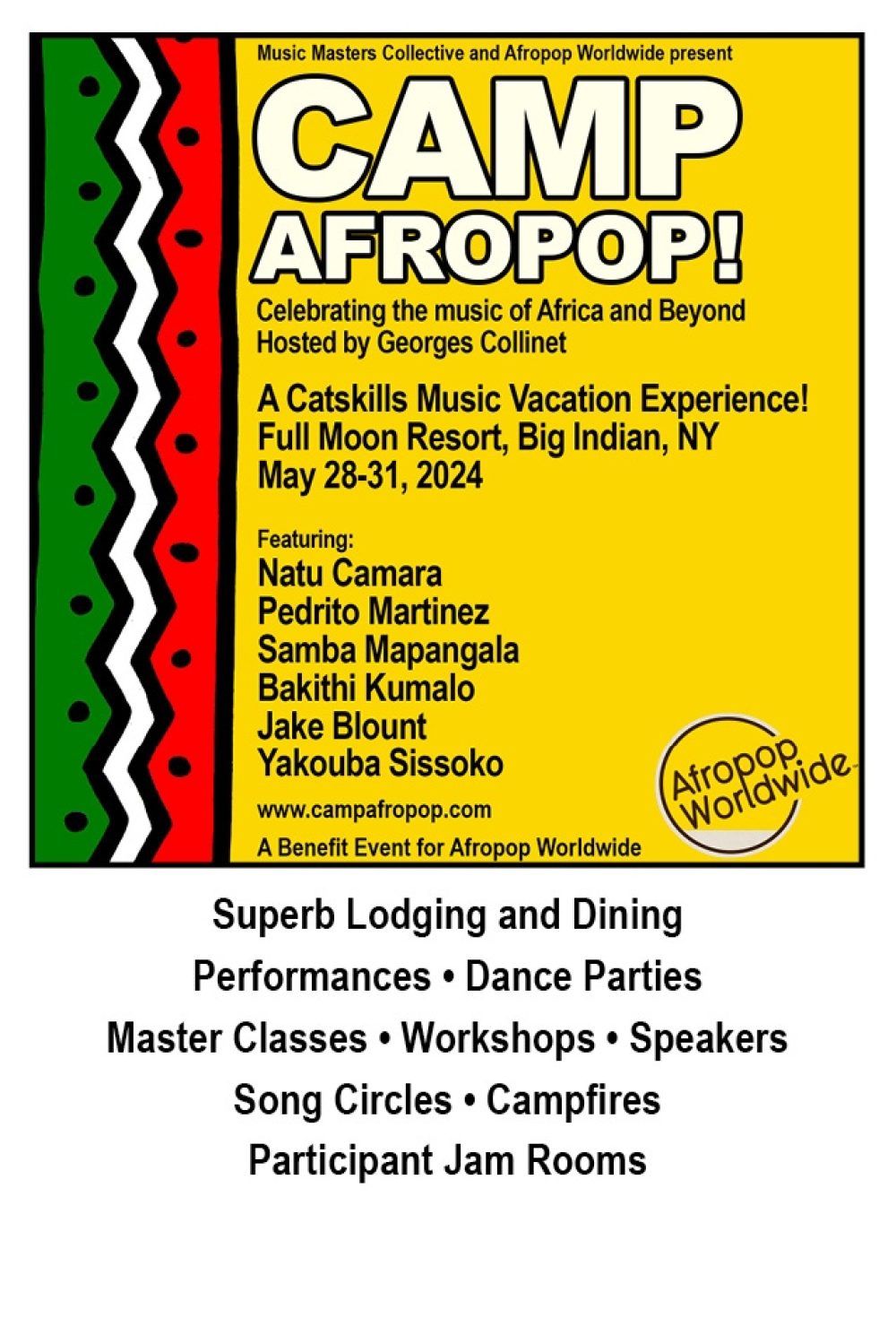 Our partners at Full Moon Resort and Music Masters' Collective are best-in-class for producing multi-day music camp experiences in the U.S., and we are thrilled to partner with them for Camp Afropop. In addition to the music and camaraderie, attendees will enjoy superb cuisine, comfortable accommodations, and let's not forget yoga and massage. Participants in Afropop events and Afropop Tours to Africa become friends for life. We have space for about 100 campers, so don't let this opportunity pass you by. Visit www.campafropop.com for more information, prices, and to register. If you have questions, email us at info@afropop.org or follow leads on the Music Masters' Collective website for contacts: (tel) 845-254-8009.