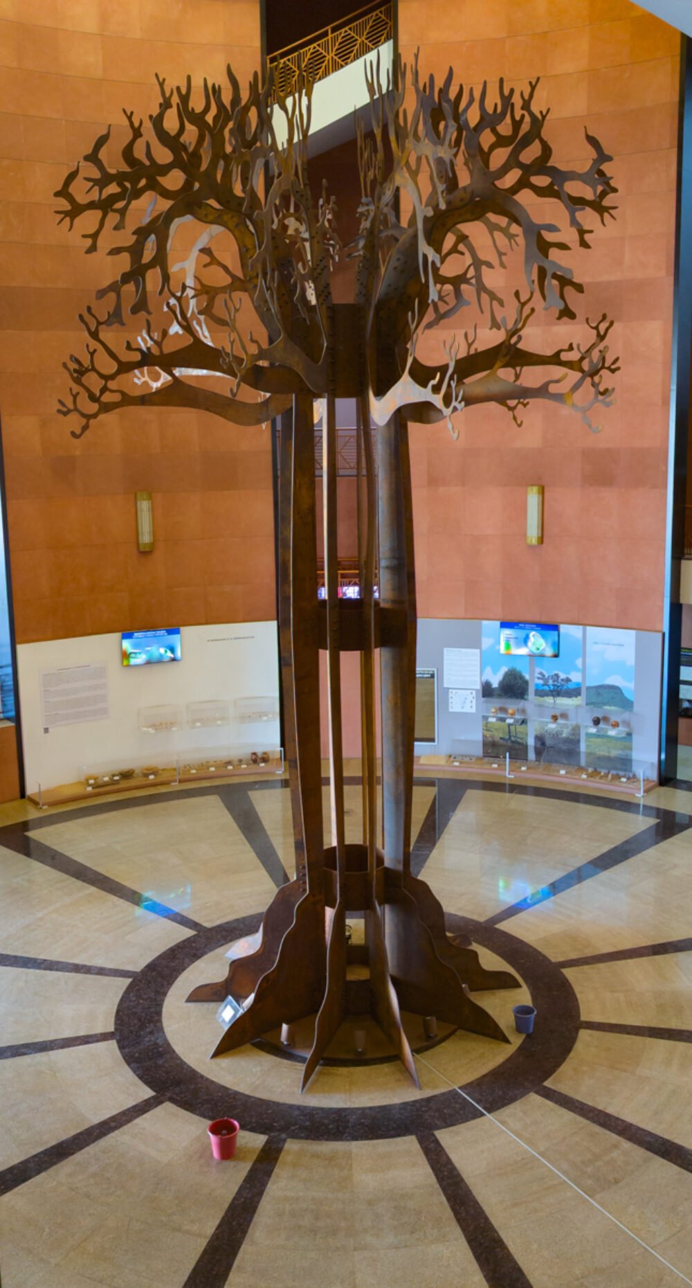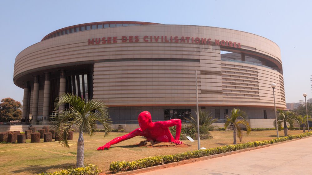 A daytime city tour took us to the towering Mosque de la Divinité and the Museum of Black Civilization, an ambitious corrective to blinkered colonial history, restoring the proper role of African and Africans in human history. Structured around a massive, metallic sculpture of a baobab tree, the first two floors present the permanent exhibit and, at the moment, four rotating art exhibits upstairs. It’s a most impressive museum, a must-see for any Dakar visit.