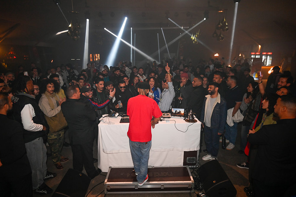 But the highlight of Aziz Konkrite’s nearly two-hour set came with an elaborate remix of his track “A Meli Melodie,” built around a vocal sample from the 1977 song “Leili a Leil” by Amazigh artists Benacer Oukhouya and Hedda Ouakki. Hailing from the rural Middle Atlas mountains, this duo became legendary for their residencies in Casablanca cabarets like “Riad Fes” and “La Terasse” throughout the ‘60s. With “A Meli Melodie,” Aziz reminded us that our ancestors loved to party just as much as we do, and he opened the track with a recorded dedication from Hedda herself, whom he had recently visited. Over a propulsive layer of booming snare drums, Konkrite introduced the song’s signature violin riff and Hedda’s plaintive, piercing voice singing “Leili a leil, ma jani na’as” [“Night oh night, I am not tired yet”] before gradually twisting the sample beyond recognition. As the pitch rose and the beat picked up, the song unexpectedly resolved into the familiar melody of Lil Wayne’s “A Milli.” The crowd, mostly composed of Rabat’s young creative types, went crazy and rapped along to Weezy’s first verse before settling back into “A Meli Melodie.” At the end of the track, Aziz faded out the electronic percussion and we were left with the raw sample of Hedda’s original voice, encouraging us to dance later into the night.