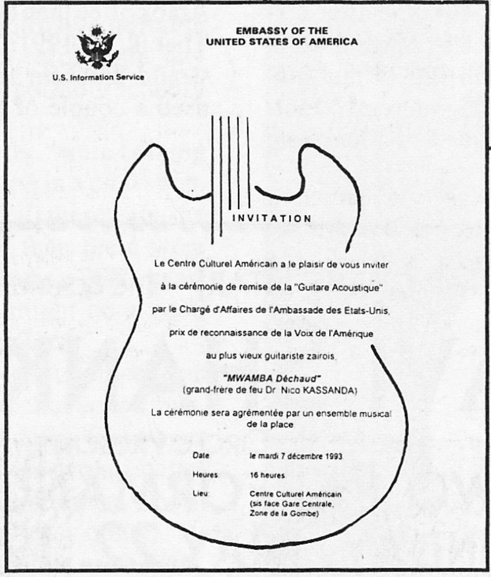 In the second part of this saga, however, Gary made good on his promise to Dechaud to send him a guitar. He bought the guitar himself and arranged with the help of Leo Sarkisian of the Voice of America’s revered program “Music Time in Africa” to have it sent to Kinshasa through diplomatic channels and given to Dechaud. An event was organized at the Centre Culturel Americain for the presentation of the guitar--"Le Prix de la VOA"--in recognition of Dechaud's contributions to music, and also honored other veteran Congolese musicians who performed live with Dechaud for the attending dignitaries.