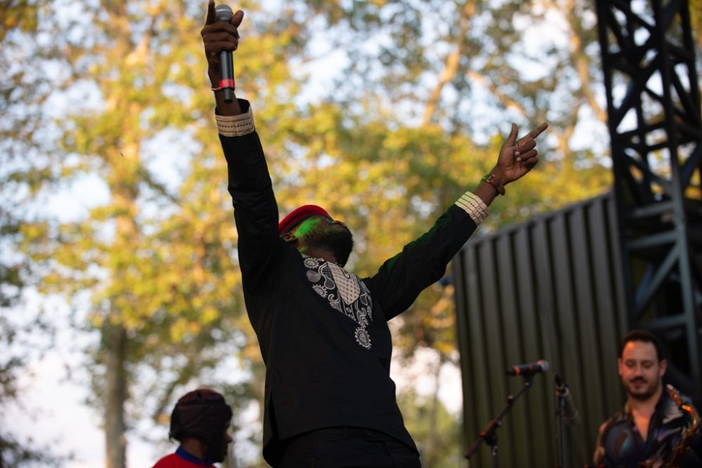 The film had its New York debut at Capital One City Parks Foundation SummerStage in Central Park last night (July 27), preceded by a spirit-raising performance by the artist, backed by an impressive band of local musicians. After just two days of rehearsal, they came off as more than comfortable in Wine’s music, which ranges from dancehall and reggae to Afrobeats, township jive, and even a gospel number (“When the Struggle is Over, We Will Wear the Victor’s Crown”) rendered as a Polka! Wine was accompanied by his long time musical partner Nubia Lee and the two of them projected joyous certainty and confidence that quickly animated the assembled crowd.