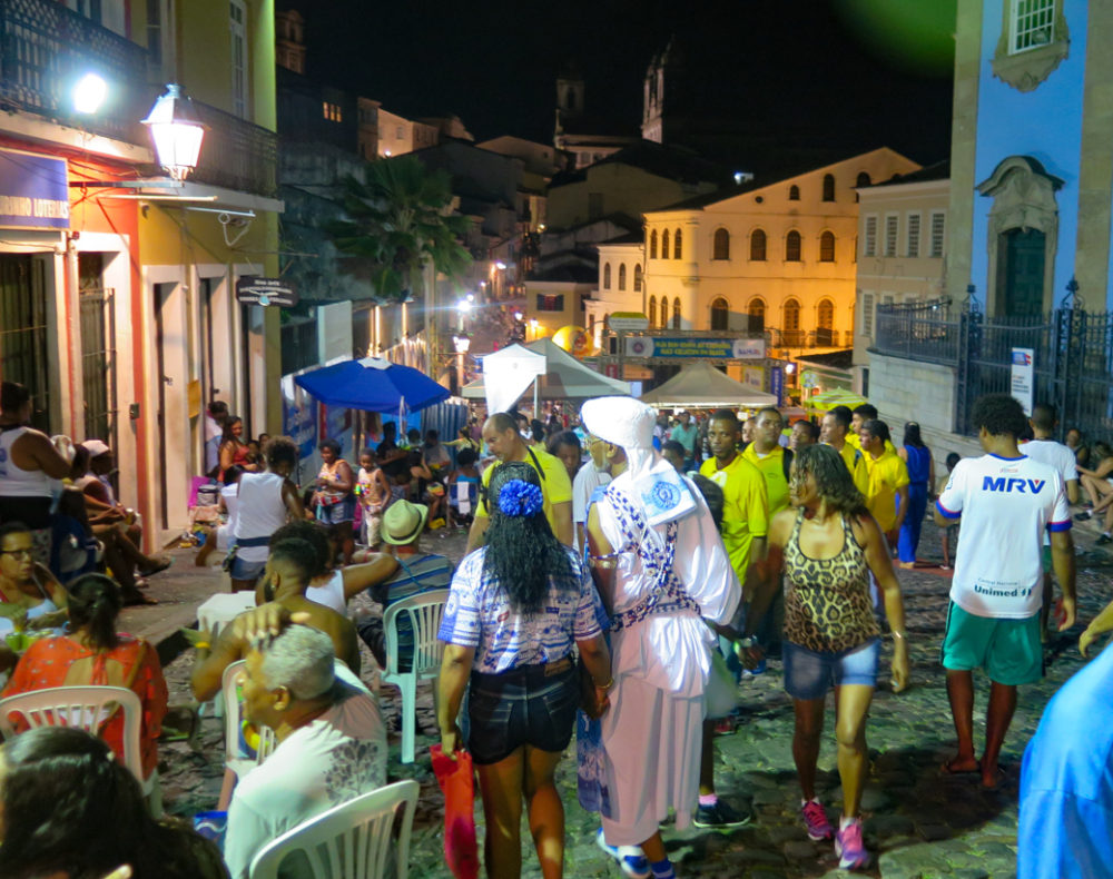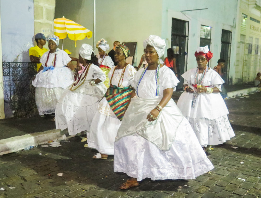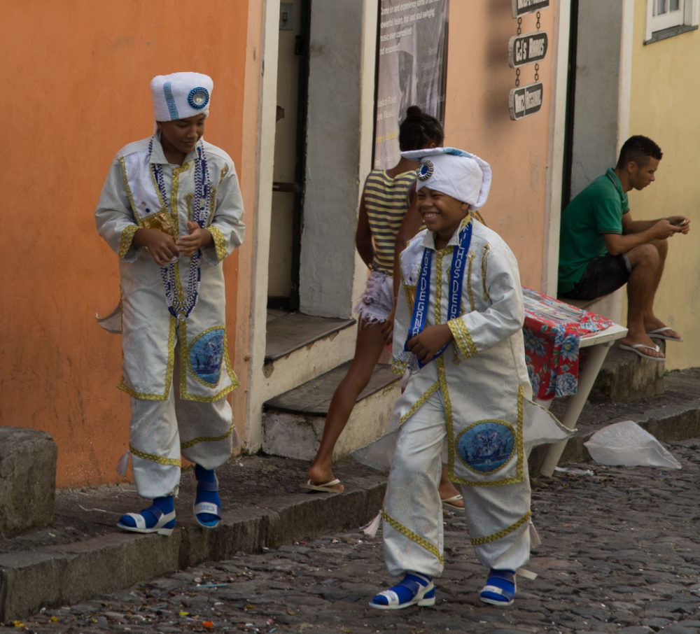 The Filhos are evident throughout the festivities, but on the last day of carnival, they gather in Pelourinho for a night-long parade through the city, en mass dancing and singing to their signature ijexá rhythm, rooted in the distinctive, animating bell pattern of Oxala, the God of Creation in the Candomble religion.