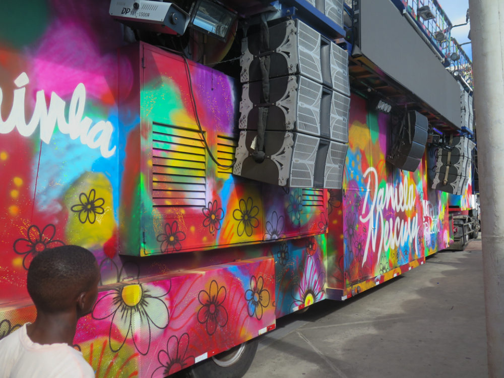Salvador, Bahia--Brazil's most African region--is said to have the country's most creative Carnival. As with Recife's Carnival, it's a highly participatory affair that unfolds in various parts of the city. The central action is a procession of semi-truck size sound systems called trios electricos. In the old days, there was simply a trio of musicians performing atop each of these rolling parties. But these days, large bands play, blasting out their melodious pulsing sound to all within earshot. Each of these booming mammoths is surrounded by a cadre of fans associated with the band or afro bloco up top. These folks form a rope line that serves to clear a small perimeter around the trio as it moves slowly through the city streets. And I mean slowly. It can take 30 minutes for one trio electrico to pass you.
