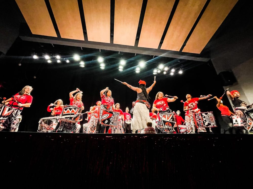 On stage that night were ensembles led by Vado Diomande, a Cumbé community dance group led by Candice Franklin, a Haitian ensemble led by Julio Jean, and the favorite for this writer, Batalá, a 22-member, all-female group of Afro-Brazilian percussionists playing classic “samba reggae” out of Salvador de Bahia, Brazil’s most African city. Batalá New York were charming—beaming and sweaty as they pounded out precise cross rhythms on drums of all sizes. The leader of Batalá New York City was the face-painted Deinya Phenix.