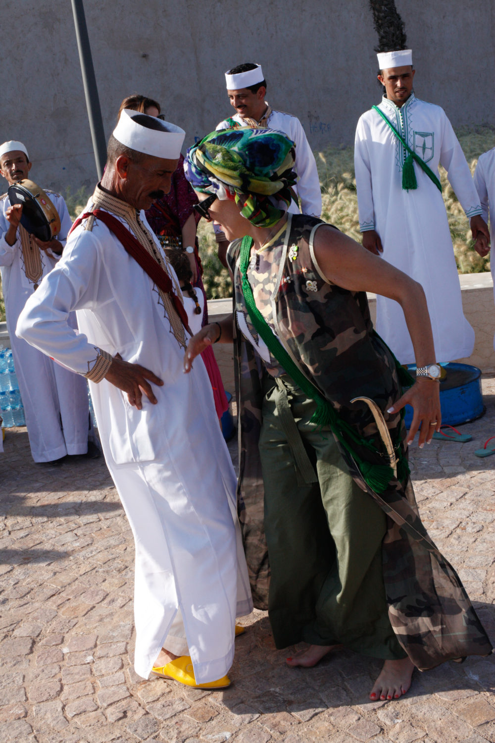 Dance, focused in the shoulders, is a big part of ahwach. The musicians used it to turn the music into a performative spectacle; the group leader would pull in bystanders, drape a decorative knife around them and show them how to dance, making sure their friends got plenty of pictures.