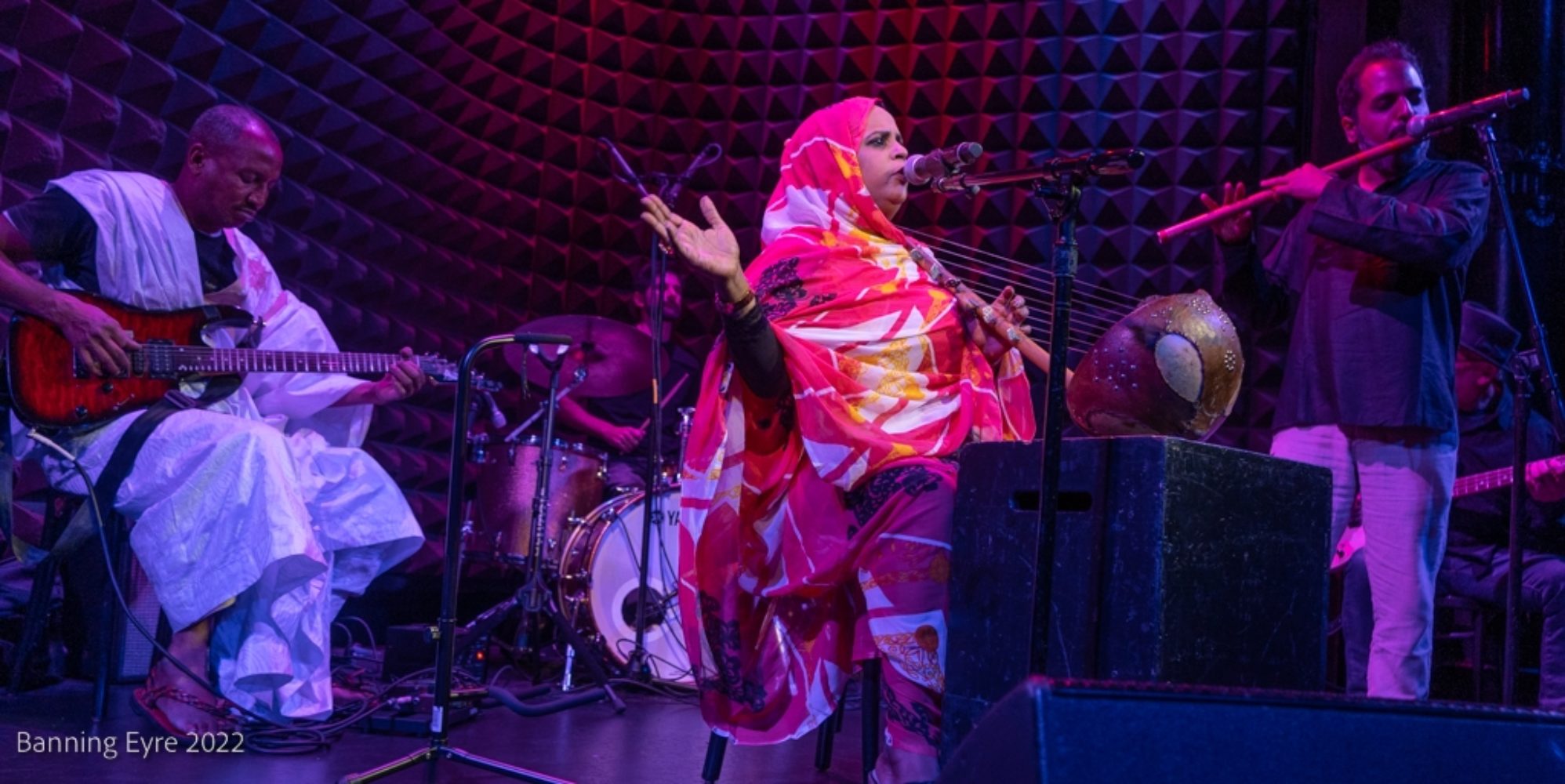 The night took us to another unexpected high through the gifted Noura Mint Seymali, who was born into a prominent line of Moorish griots, West African praise singers, poets and musicians. She began her career at age 13 as a supporting vocalist with her step-mother, the legendary Dimi Mint Abba. Noura’s vocal training also included instrumental and vocal technique from her grandmother, Mounina, who mastered the ardine, a harp reserved only for women. Blessed with this musical lineage, singing at weddings with family, gave her a solid foundation that has lifted her to the heights of musical royalty that can only be claimed by very few anywhere in the world. Seymali Ould Ahmed Vall, Noura's father, was similarly an important teacher, himself a seminal figure in Mauritanian music who adapted music for the national anthem, devised the first system for Moorish melodic notation and composed many works popularized by his wife, Dimi. Seymali encouraged Noura’s compositional talent and influenced her earliest experimentations with fusion music. Raised in this rich musical culture where sounds from across the ancient trade routes meet at the confluence of the Sahara, the Magreb and West Africa, Noura Mint Seymali is without a doubt one of the most exciting artists coming out of not just Mauritania, Africa or SWANA, but the world. Her husband Jeich Ould Chighaly’s adds more fuel to the fire through his original genres of blues, rock and roll and psychedelica guitar licks. Mauritania’s premier bassist Ousmane Touré was missed but replaced by a last minute local New York bassist Tony Maimone, and drummer/producer Matthew Tinari, with special guest Jay Gandhi on the bansuri flute, who combined as her band. They were able to whip up the crowd into spontaneous standing ovations, clapping of hands, laughing, shouting and asking for more.