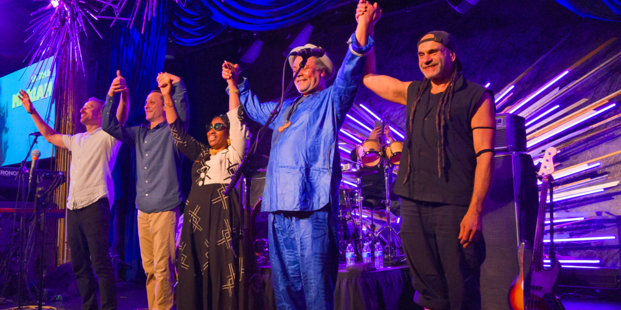Sam’s is a story for another day. In short, this California native spent part of his childhood in Burkina Faso, was able to learn Malian songs from records as a teenager, traveled to Mali multiple times, founded an excellent band, Benyoro, in New York in the 2000s, moved to New Orleans and wound up recruited first on bass with the A&M band, and then on guitar and as musical director with Fatoumata Diarara. Currently based in Paris, Sam stepped up admirably at the show, spinning out guitar solos that merged Bambara boogie and rock influences very much as Amadou might have done, and with considerable showmanship. Charlie, Yao and Sam all sang, filling in Amadou’s vocal parts on a succession of A&M hits, including the one that first broke them internationally, “Je Pense à Toi (I Think of You).”