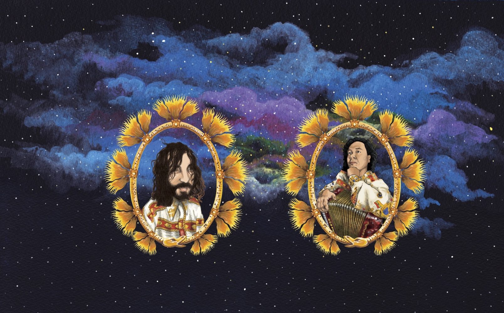 From the first moments of the Meridian Brothers’ new album, Paz En La Tierra, you can hear that something is different. The band—which is just Colombian musician Eblis Álvarez unless playing live—has teamed up with Conjunto Media Luna’s Iván Medellín for the new album. Centered on Medellín’s accordion, the resulting album draws heavily from traditional vallenato, an Afro-Indian-European music from Colombia’s Caribbean coast. Fans of outre-cumbia are treated to the folkier forebear of the ‘60s-and-onward cumbia canon Alvarez usually sounds like he’s drawing from. Colombian merengue (not to be confused with Dominican merengue) and other Caribbean forms like son are all fed into the Medellín-Álvarez machine. But even though hand percussion and accordion have replaced the dubby swells, nasally synths and programmed drums that characterize Álvarez’s work with both the Meridian Brothers and Frente Cumbiero, Paz En La Tierra’s songs still look forward to an anxious future. It may be in the shape of Colombian paseo, but the song “La Conquista de Outros Planetas” is actually about space colonists conquering other planets. Out today on Bongo Joe Records, Paz En La Tierra is, both at first glance and twelfth glance, a kinda weird left turn by Meridian Brothers. But then, their formula starts with ear-worming micromelodies, anchored by headbobbing basslines and then is washed over in weird left turns. Paz En La Tierra has an abundance of all three.