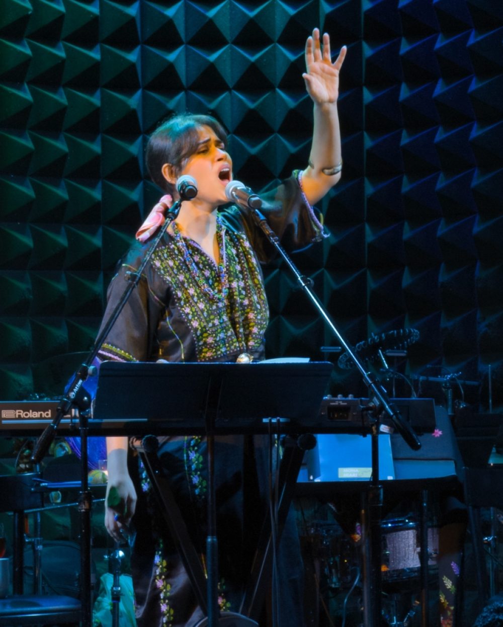 On night two, the focus was on Palestine, and naturally, the mood was more understandably more reflective and sometimes somber. It began with another artist stepping in for Abozekry. Issra Shalaby delivered a moody, rhythmless performance, singing an extended piece backed by electronic drones, and at times, a steady beat on her circular frame drum. Her soaring, plaintive voice cast a spell. It was often hard to tell whether she was singing words or simply sounds. But the message was emotional, not textual.