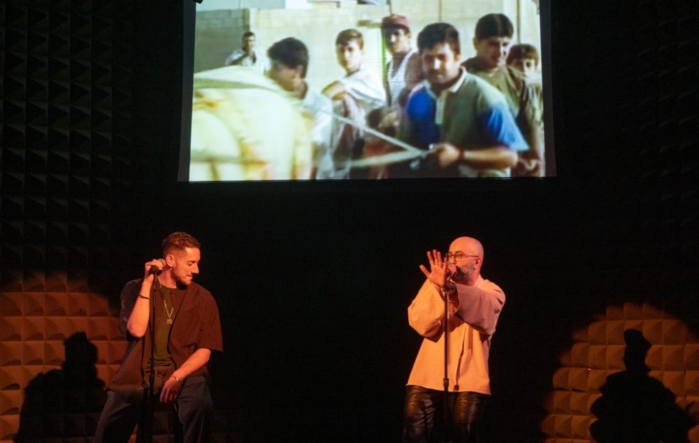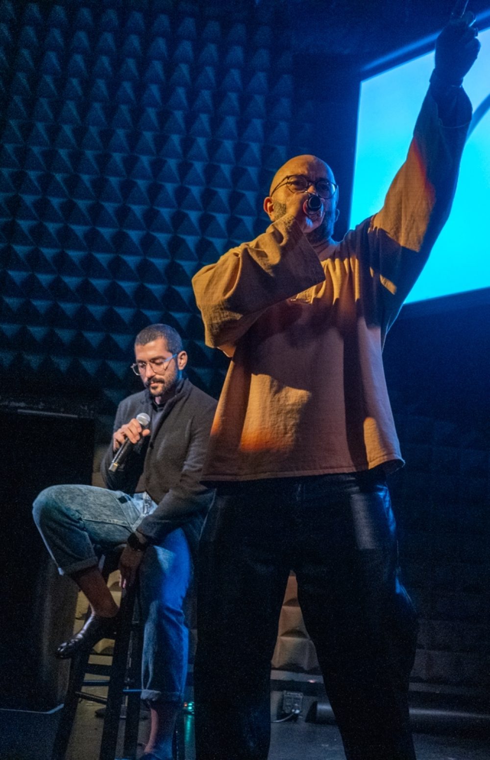 The mood changed sharply when Iraqi-Canadian rapper, professor and multi-media artist NARCY took the stage for the second half. His energized, fiery raps delivered before a barrage of images evoking tumultuous histories from the SWANA region was riveting. NARCY makes a point of inviting other voices from the region to join him in his performance, so we heard soulful spoken-word evocations by artists from Lebanon and Sudan—the latter a country whose ongoing tragedies are too often overlooked. This was NARCY’s first performance this year. He keeps busy with his professorial activities in Montreal, and performs only when he feels he has “something to say.” Well, he had plenty to say this night. He also announced the upcoming release of a double-vinyl album, his first recording in some years.
