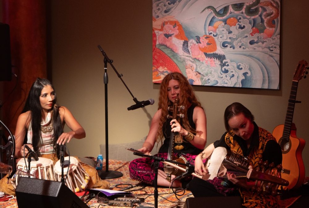 There were two superb musical performances. Mehrnam Rastegari, and Iranian kamancheh player and singer who has quite recently arrived in New York was accompanied by two other women, Camila Celin on sarod & guitar and Roshni Samlal on tabla. It was a central Asian, all-female powerhouse. Absolutely beautiful.