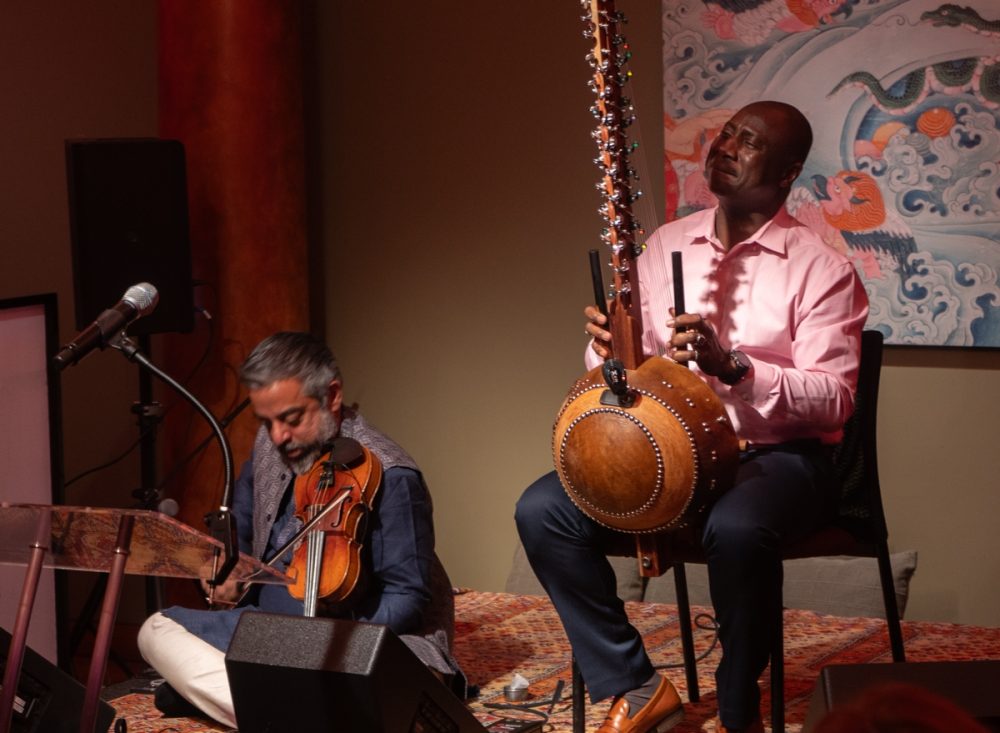 Then New York-based Malian kora player Yacouba Sissoko performed two pieces with South Indian (Carnatic) violinist Arun Ramamurthy. These two musicians, playing together only for the third time, delivered pure magic. The first piece unfolded with the peaceful, propulsive lope of Mande music, with the two artists exchanging delightful improvisations. The second, a composition by Ramamurthy, required Sissoko to retune his kora to an Indian scale, and fireworks ensued.