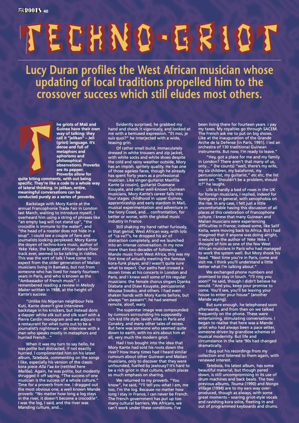 In memory of Mory Kante, we bring you a wonderful article written by Lucy Duran for Folk Roots magazine in 1997. Lucy has gone as deeply into Mande music culture as any Westerner we know, and she has a great story to tell about her encounters with Mory. Thanks to Lucy and Ian Anderson for permission to reprint this fine piece of writing in memory of another fallen hero of African music’s golden age.