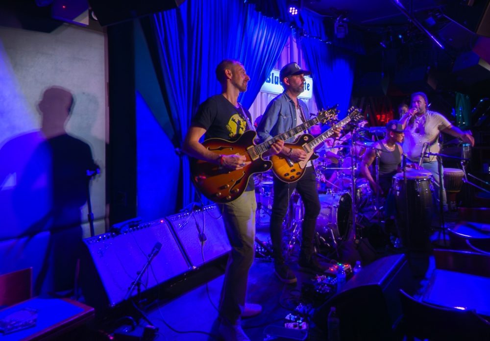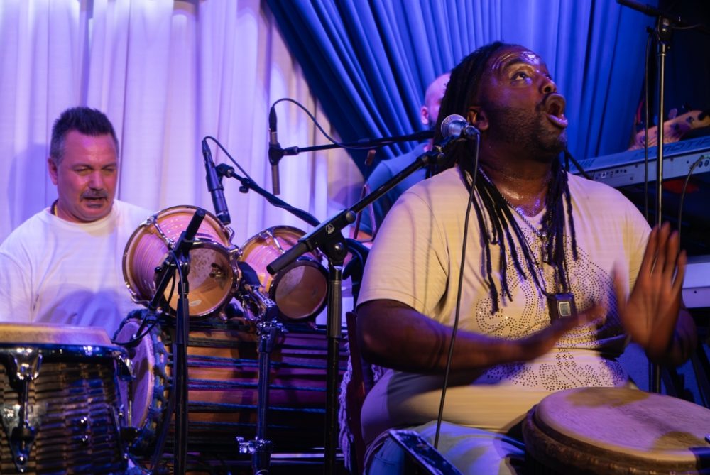 From LPR, it's a short walk to the Blue Note, where Weedie Braimah and the Hands of Time out of New Orleans were beginning a three-night return visit. Weedie comes from a line of percussionists on both sides, via his Ghanaian father and American mother, an acclaimed New Orleans funk and jazz drummer. Braimah has spent serious time in West African learning traditional techniques and rhythms and he's assembled a powerful band with three other percussionists, two keyboard players, two guitarists and a bass man. The tunes are exhilarating, driving, dense and often danceable. Midway through the set, Braimah invited up his friend, monster Cuban conguero Pedrito Martinez. With four flying hands, plenty of smiles and blinding technique, the two players had the crowd on their feet and rocking.