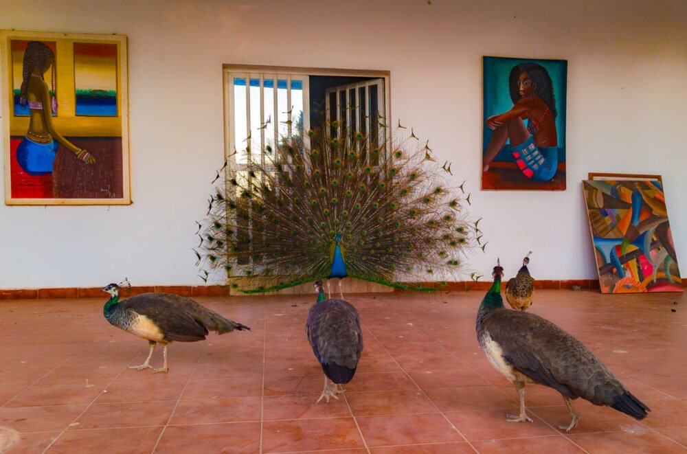 On Saturday, we traveled south of Dakar to the village of Mbounk Bambara to visit our old friend Baaba Maal. His peaceful compound, far from the hubbub of the city, but just ten minutes from the airport, includes a large performance space, a recording studio, and some 15 peacocks strolling around, occasionally unfurling their spectacular feathers. I asked Baaba if the birds had names, and he pointed to one and dubbed it “Sean Barlow.” We’ll see if the name sticks.
