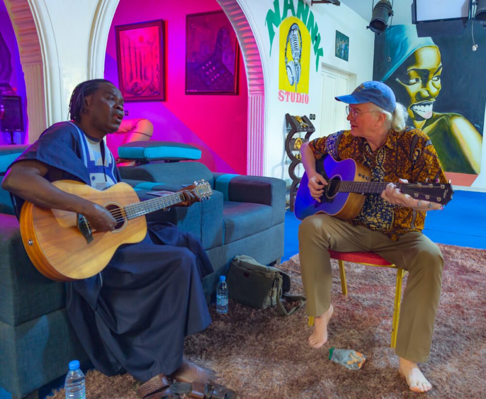 We chatted, recorded a brief interview, and presented Baaba with a French-language version of our 1995 Afropop book, with his image on the cover. (He already had the English one, but was delighted with the gift.) I even got to play a few songs with Baaba. My years playing Malian folklore provided us with easy common ground. Baaba encouraged us to attend his Blues du Fleuve festival up north in Podor, where he was born and raised. The festival happens early in December and features both local and international music in a gorgeous natural setting. Very tempting!