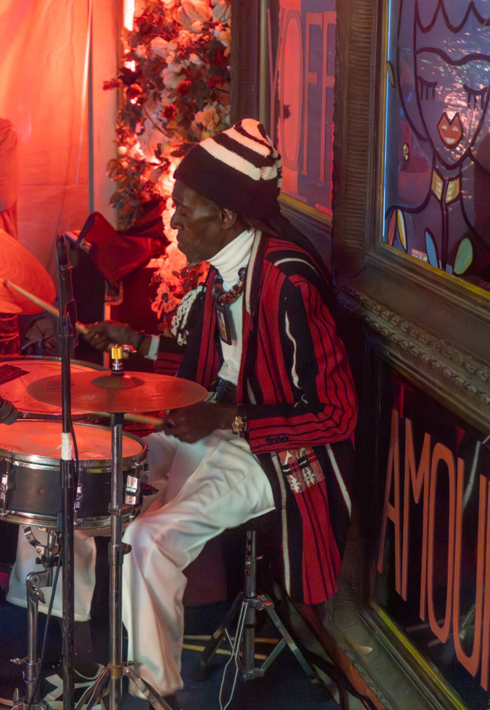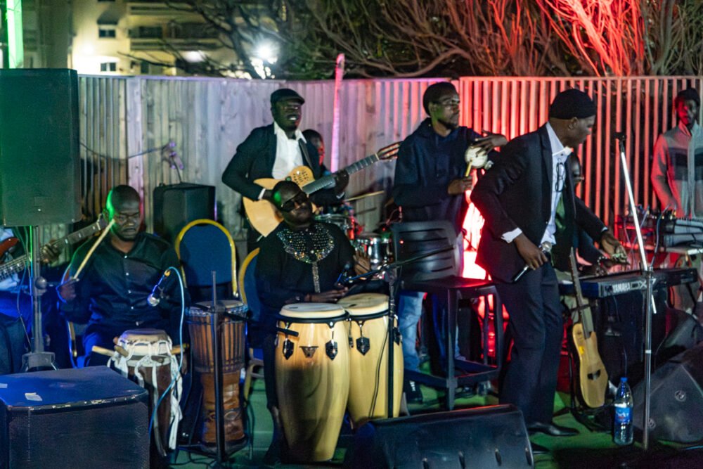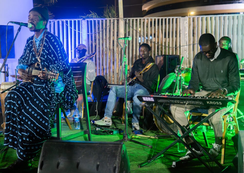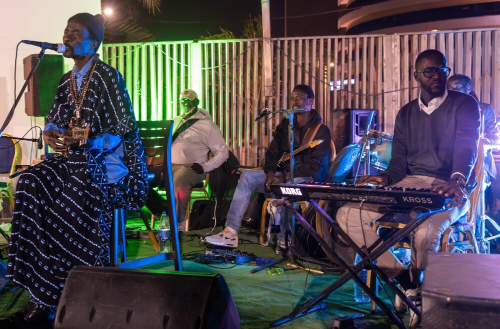 We started at Lala Beach, a pleasant seaside venue in Yoff with excellent food. This is a favorite performance spot for the great Cheikh Lô. We’ve seen Cheikh in the U.S., most recently at globalFEST in New York City in 2020. But this was truly special, the 50-years-in-music veteran leading his crack, six-piece local band, unbelievably tight and sweet as they rolled out his unique blend of Latin-tinged, pan-West African roots music. As is his habit, Cheikh began the set on trap drums, his first instrument, and his style is playful and distinctive. The show started before 11pm and we hated to leave, but we had a big plan for the night.
