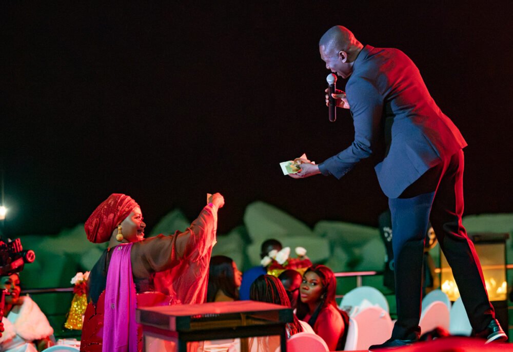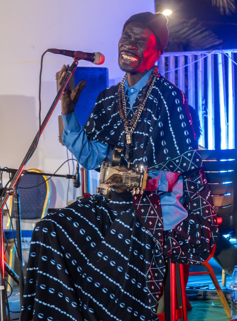 Banning had an invitation to Pape Diouf’s show at the Azalai Hotel on the Corniche. This was an extravagant event, with dinner included, and a ticket price of over $100. The clientele for the show was extremely well-dressed and upscale, with a preponderance of women. Once again, there was quite a long wait for the music to begin, but shortly after 11PM, things got cooking. Diouf is a charismatic stage presence with a high, reedy voice and suave dance moves. The band sounded wonderful in the open air, and the love flowed freely, including a stretch where ladies dressed at Met Gala levels dispensed cash to the singer. A lively pair of male and female dancers animated the long walkway before the stage, acting out dramas and interacting with Diouf and his musicians in high-spirited manner.