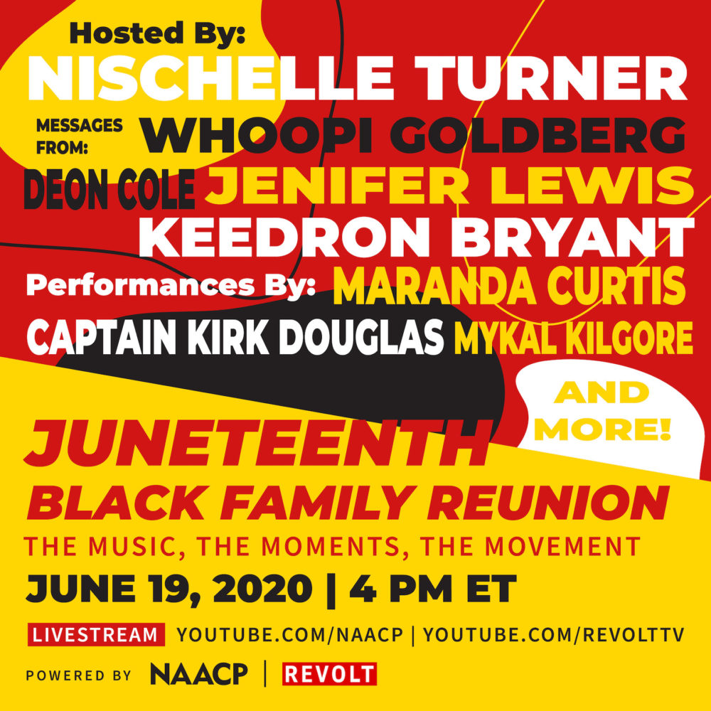 The NAACP, in conjunction with REVOLT, will host a special virtual Juneteenth Black Family Reunion and Juneteenth virtual Town Hall on Friday, June 19 at 4 p.m. EST and a virtual town hall discussion at 6 p.m. Participants can view both events live via the NAACP or REVOLT YouTube channels.