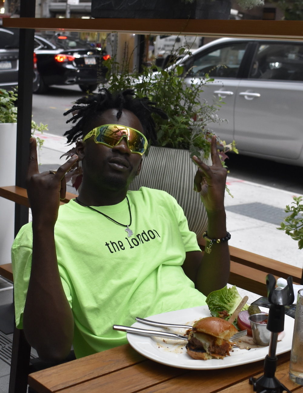 If I didn't know that Mr Eazi was a star before we sat down, I probably would've figured it out when the wide-eyed waitress came by to greet him by name. But I'm sure I would've figured it out when she came back to say that Eazi could get his hamburger and dessert for free if he mentioned the burger in the interview, only for Eazi to counteroffer that he'd also need $50,000 to do it. I didn't see a check, so I'll just say the interview took place in Manhattan and leave it at that.