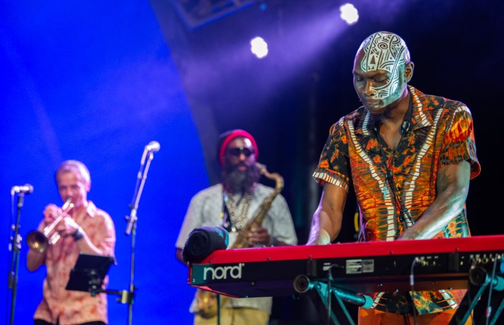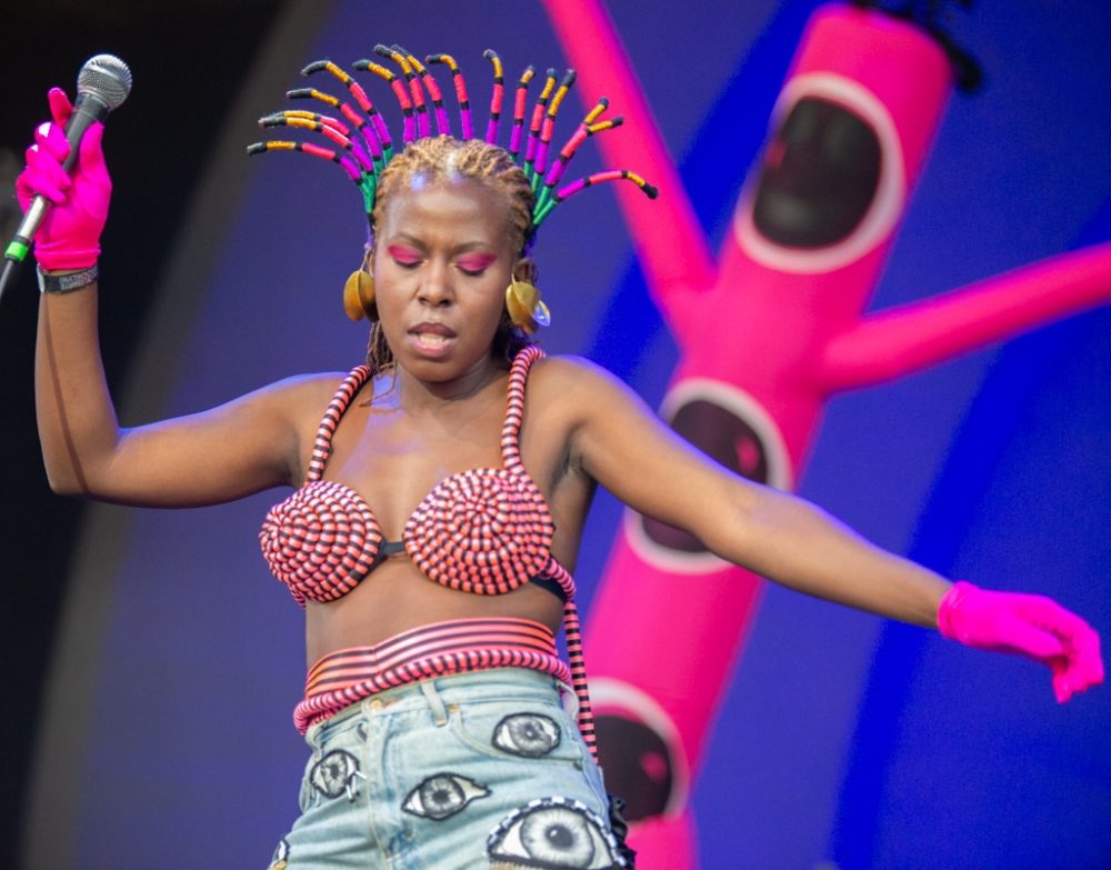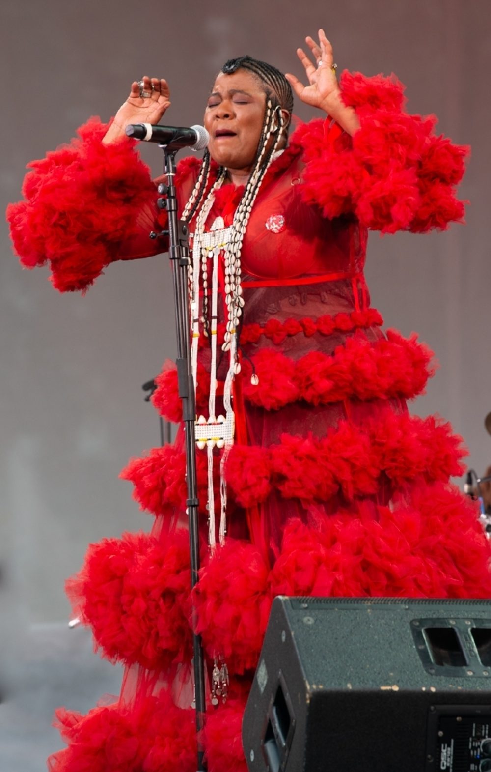 On Saturday, the action moved to The Lena Horne Pavillion for Celebrate Brooklyn with Lollise and Seun Kuti and Egypt 80. Lollise co-hosted and co-produced APWW’s Botswana Dumelang, along with producer Morgan Greenstreet, who is also now her excellent drummer. The two took the big stage alone with just two pink air dancers as foils. The dancers were invented by a Trinidadian Carnival designer Peter Minshall! and Lollise hand painted them. Later two human dancers joined, but it was really a showcase of unusual Afro-rhythms and Lollise’s rich, confident voice. An art show with a beat. The group was also joined by keyboard player Elenna Canlas on synths, vocals and percussion for three songs. (I hope the air dancers were compensated. They worked hard.)